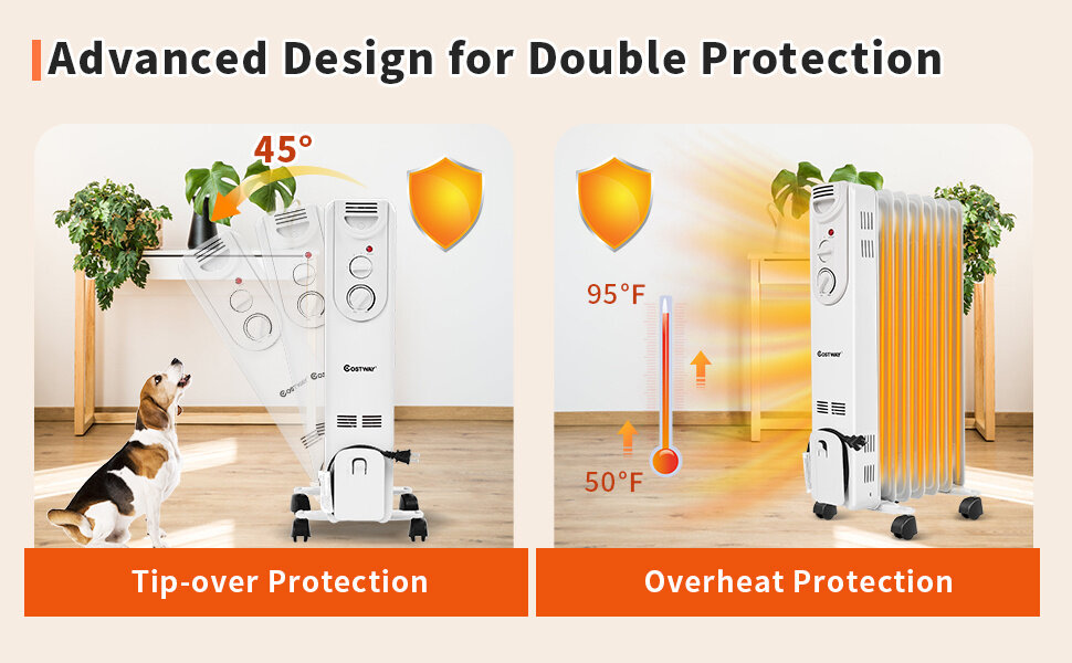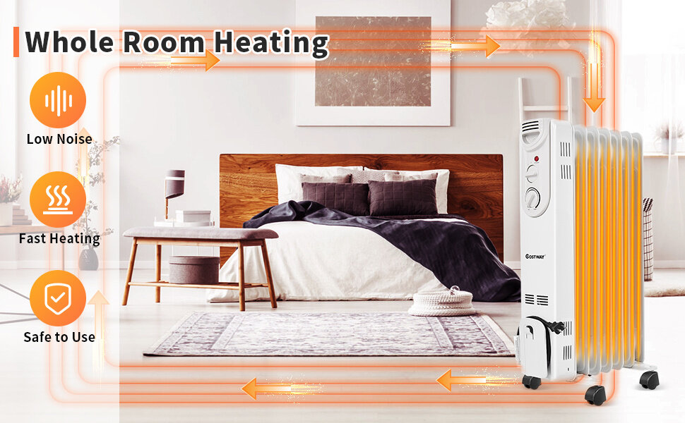 This efficient radiator heater can warm your room in a short time. You can set the temperature and power as needed. Overheating and tip-over protection will offer you double safety protections and prevent accidents. You can have a sweet sleep due to the noise-free design. Conduction oil is packed and sealed, so you don’t need to add extra oil. Front handle and universal casters ensure the easy movement. The wire can be twined on the bracket to avoid the mess. And the stable bottom design reduces toppling easily.