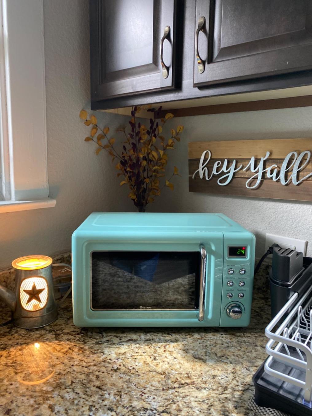 Darling aqua colored microwave! Fits perfectly on my countertop! Makes a great accent in your kitchen! Love the size!